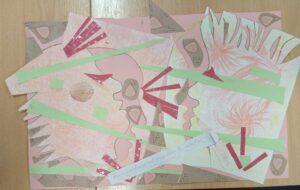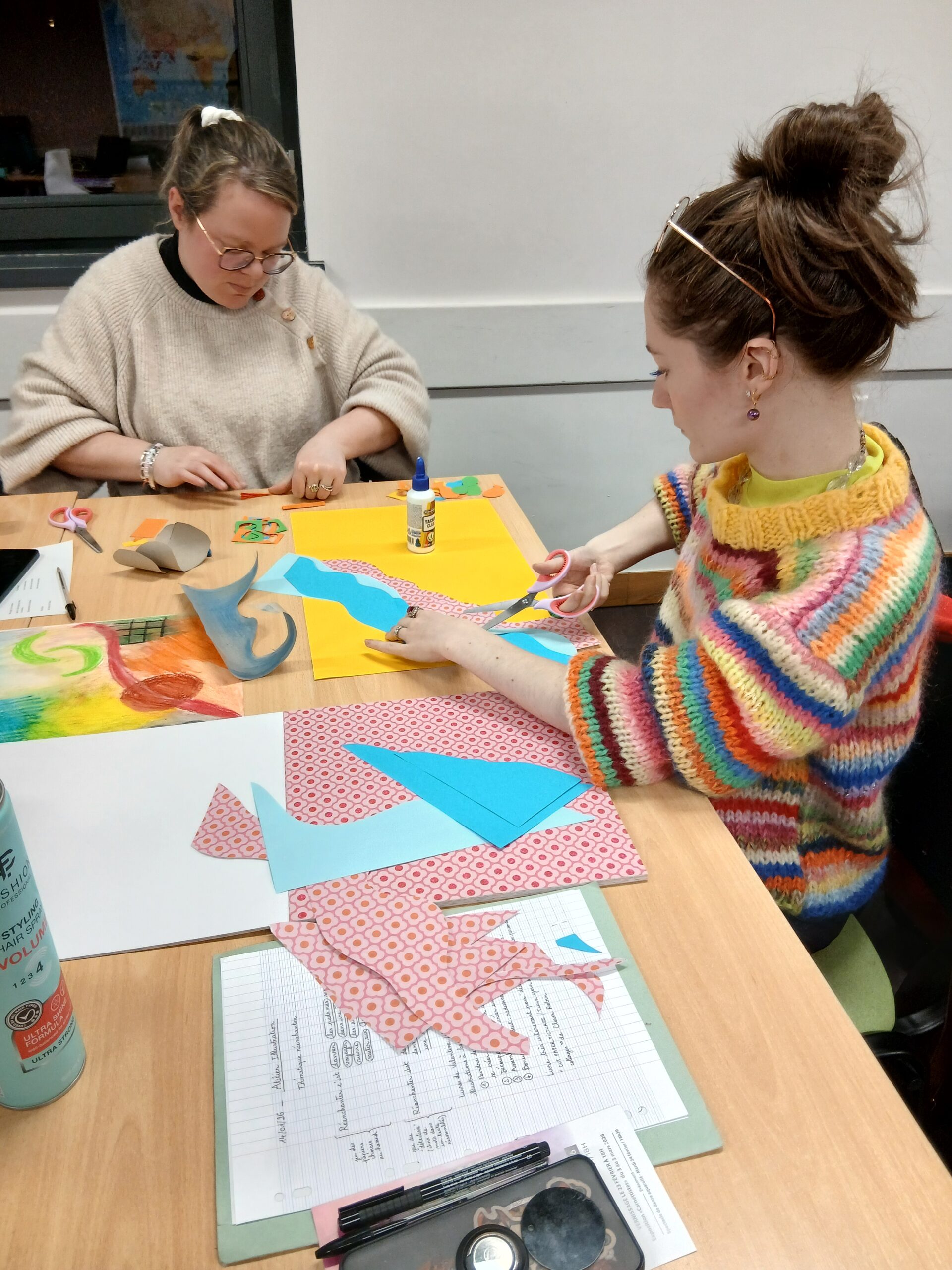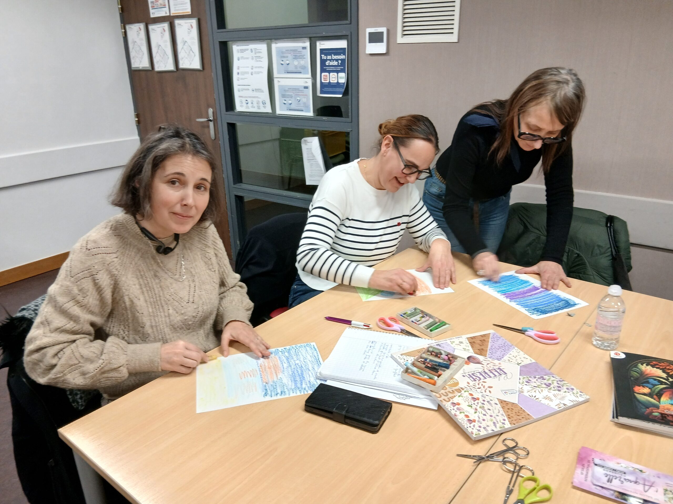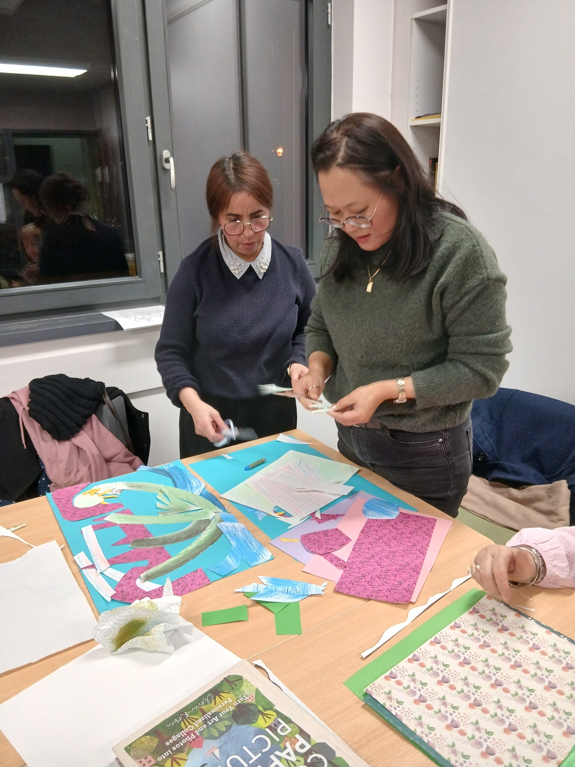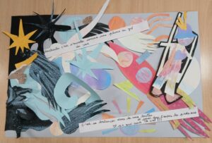 C’est donc cette démarche que les accompagnateurs et bénévoles ont expérimentée : découpage, collage, mais aussi découverte de nouvelles pratiques avec l’utilisation de pastels et de craies sèches, afin de fabriquer rapidement des fonds avec les enfants.