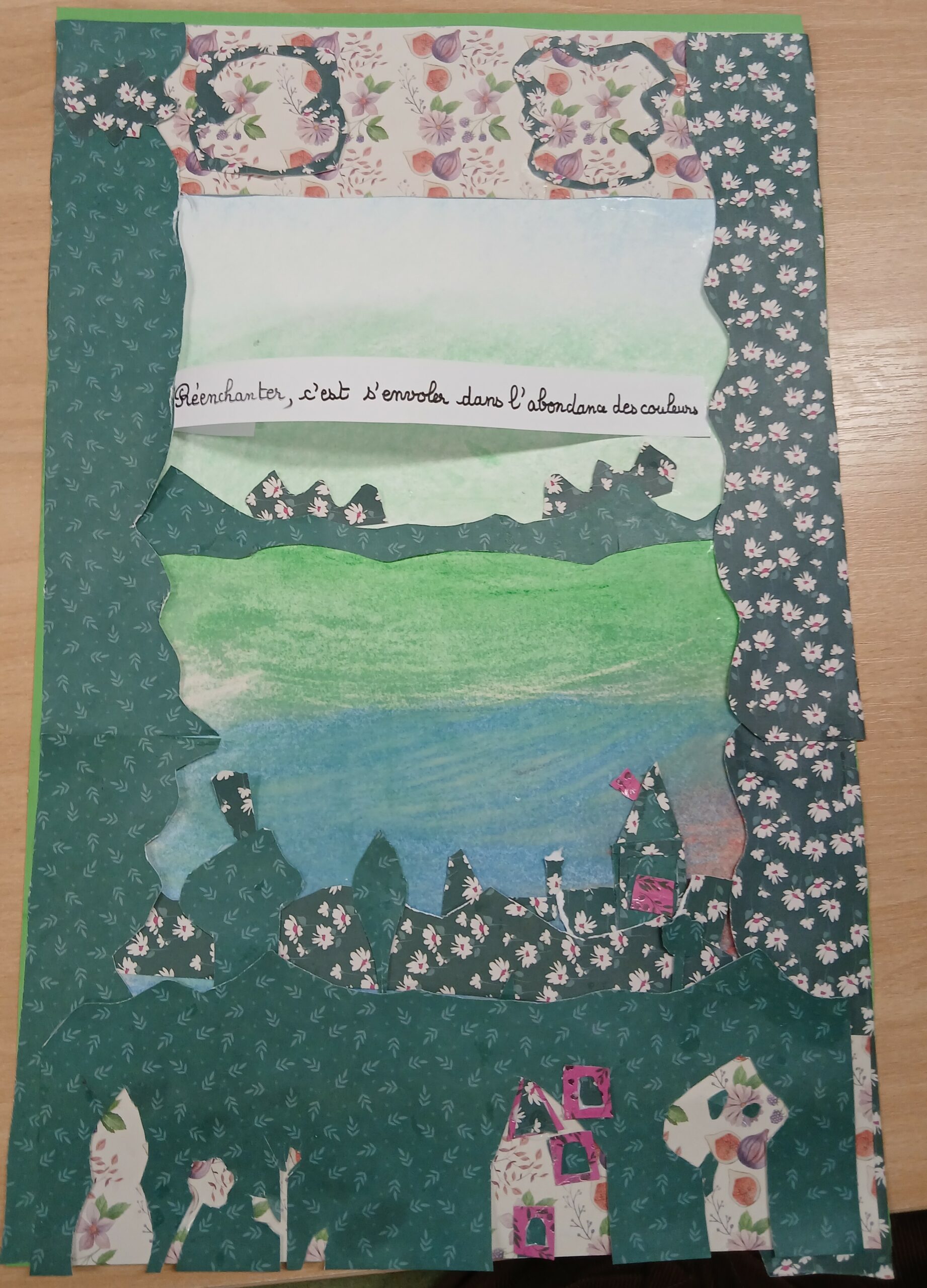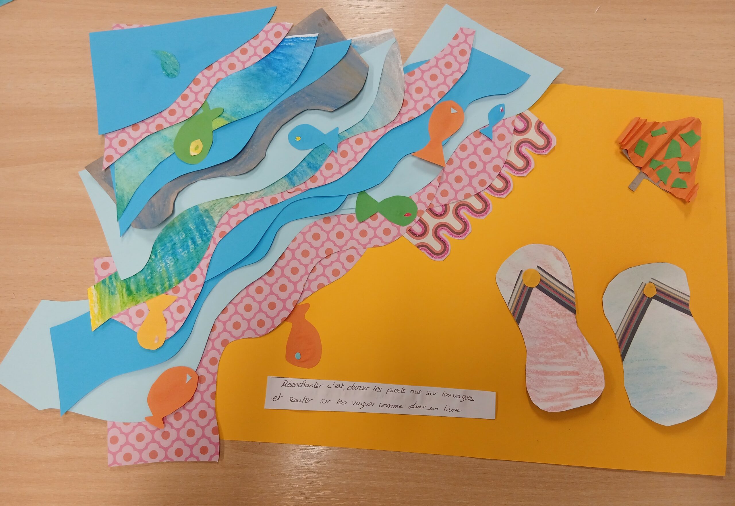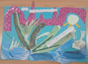 Pour nourrir leur créativité, les participants se sont inspirés du livre « Et ici » de Valentine Lafitte, illustratrice. Son travail se caractérise par des collages de papiers découpés : elle peint de grandes feuilles, crée elle-même ses couleurs avec une sensibilité très fine, puis les découpe en différentes formes pour composer ses tableaux.